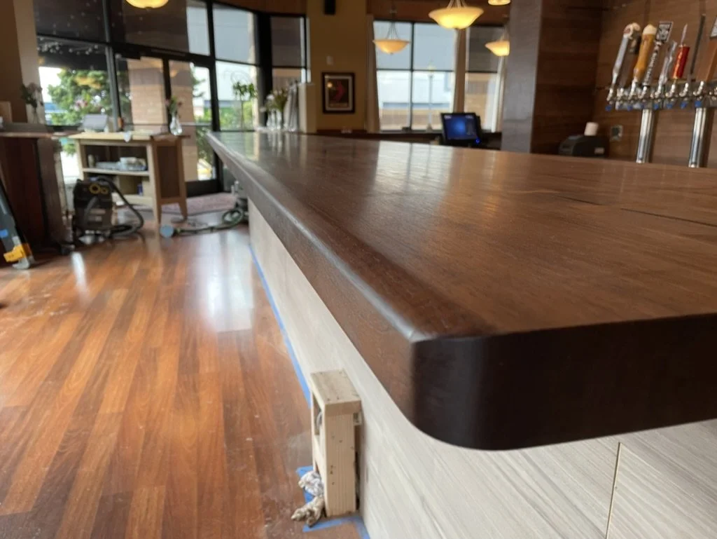 Sunday was such a relief. We had the place to ourselves. The bar had been sanded with 220 grit paper but Adam decided it wasn’t good enough so he scraped the 30-foot-long bar with a cabinet scraper, cutting the final surface instead of grinding it. He fussed and fussed over the edge treatment and then executed the perfect solution. What a glorious moment it was when the oil was finally laid down. We were stunned by the beauty of it. Yet there was still so much to do